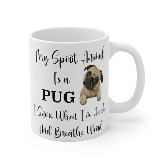 My Spirit Animal Is a Pug Ceramic Mug, Funny Pug Lover Gift, Snoring Pug Humor Coffee Cup, Dog Owner Gag Gift, 11oz White Ceramic Mug
