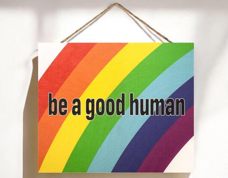 JennyGems Be a Good Human, Rainbow Pride Decorations, Gay Pride Sign, Welcome Hanging Sign Gay LGBT LGBTQ Pride, 10x12 Inch Wood Sign, Inclusive, Gay and Lesbian Gifts, Love is Love