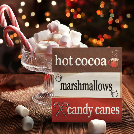 Christmas Decor, Hot Cocoa Marshmallows Candy Canes 3pc Mini Wooden Block Signs, Christmas Gifts, Made in USA