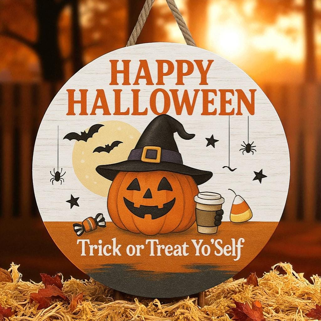Celebrate Halloween with this charming 16-inch round door hanger featuring a cheerful jack-o'-lantern sipping coffee and surrounded by festive bats, spiders, and candy. Crafted from durable, waterproof PVC with direct printing that resists fading, it's perfect for front doors, porches, or indoor walls. The included braided rope makes hanging effortless. Ideal for seasonal décor, parties, or gifting to fellow Halloween enthusiasts.