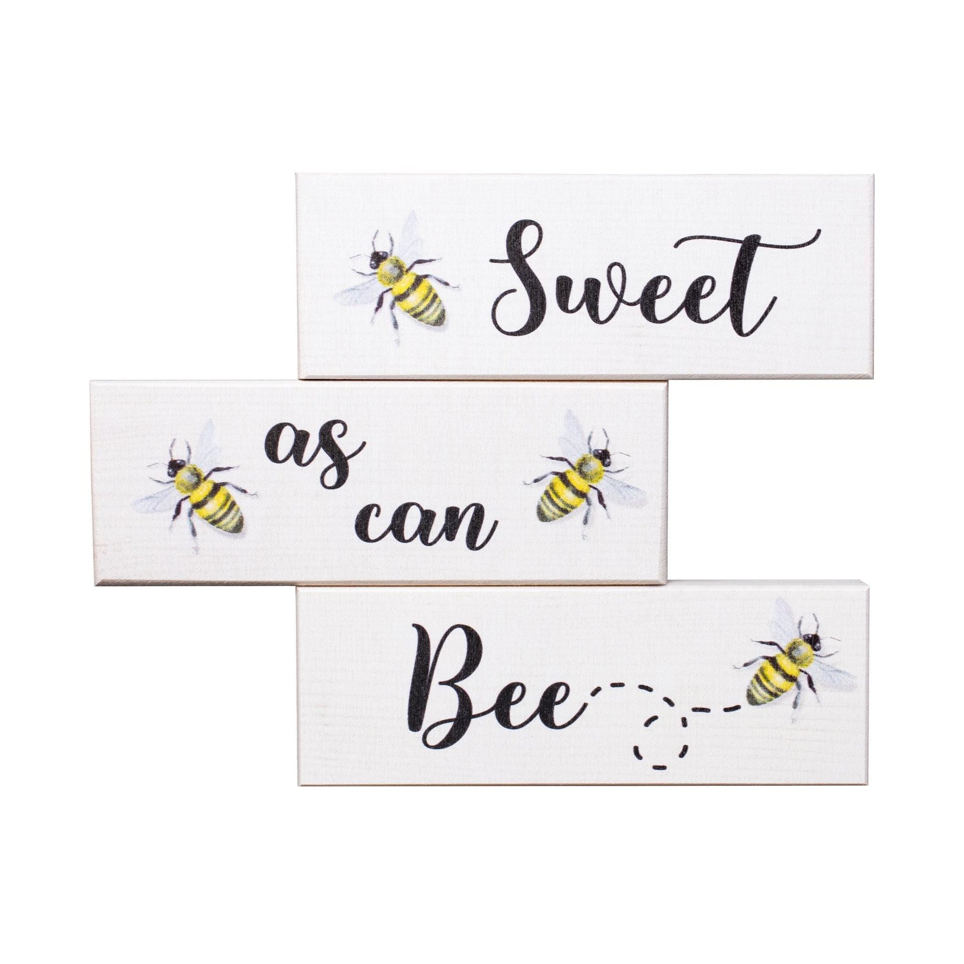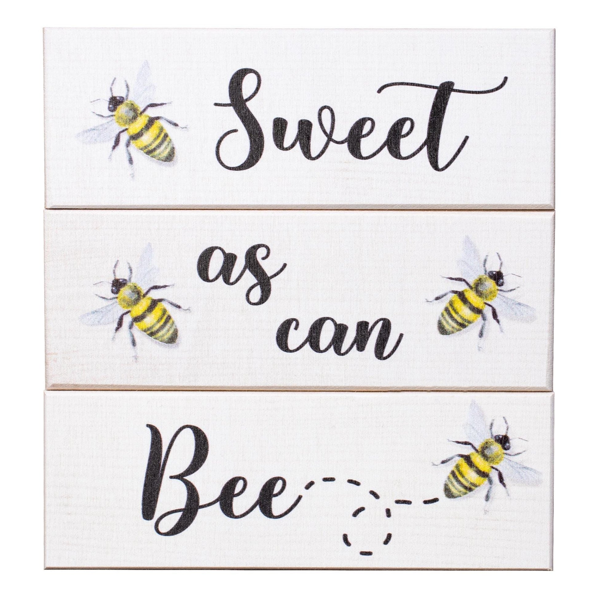 About: This 3pc mini wood block set can be displayed year round or it can add charm to seasonal indoor decorations at your home or office. Signs feature a beautiful sweet message Sweet As Can Bee. Each wood block measures 5.5 x 2 x .75 inches.