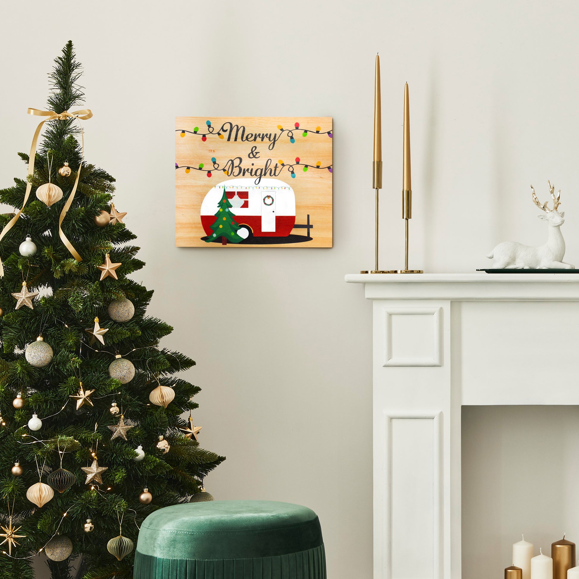 - Festive Christmas Design – This charming "Merry & Bright" wooden sign features a whimsical Christmas camper, string lights, and a Christmas tree, perfect for adding a festive touch to your holiday decor.