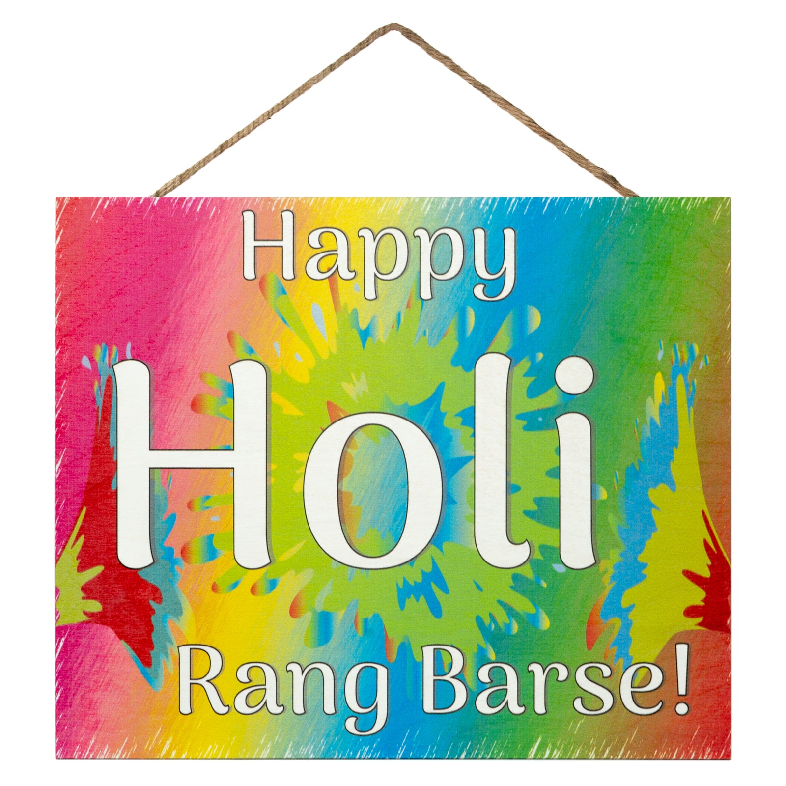 Celebrate the festival of colors with this vibrant 10x12x.25 inch wooden sign featuring "Happy Holi Rang Barse!" messaging. Pre-mounted with hanger and string for effortless display, this handcrafted piece brings the joyful spirit of Holi into your home. Crafted from premium domestic wood, it combines durability with festive appeal, making it an ideal accent for spring celebrations or a thoughtful gift for hosts and guests alike. The bold, colorful design captures the essence of this cherished Hindu holiday—a time for family, renewal, and togetherness. Perfect for adding warmth and cultural significance to any gathering or living space.