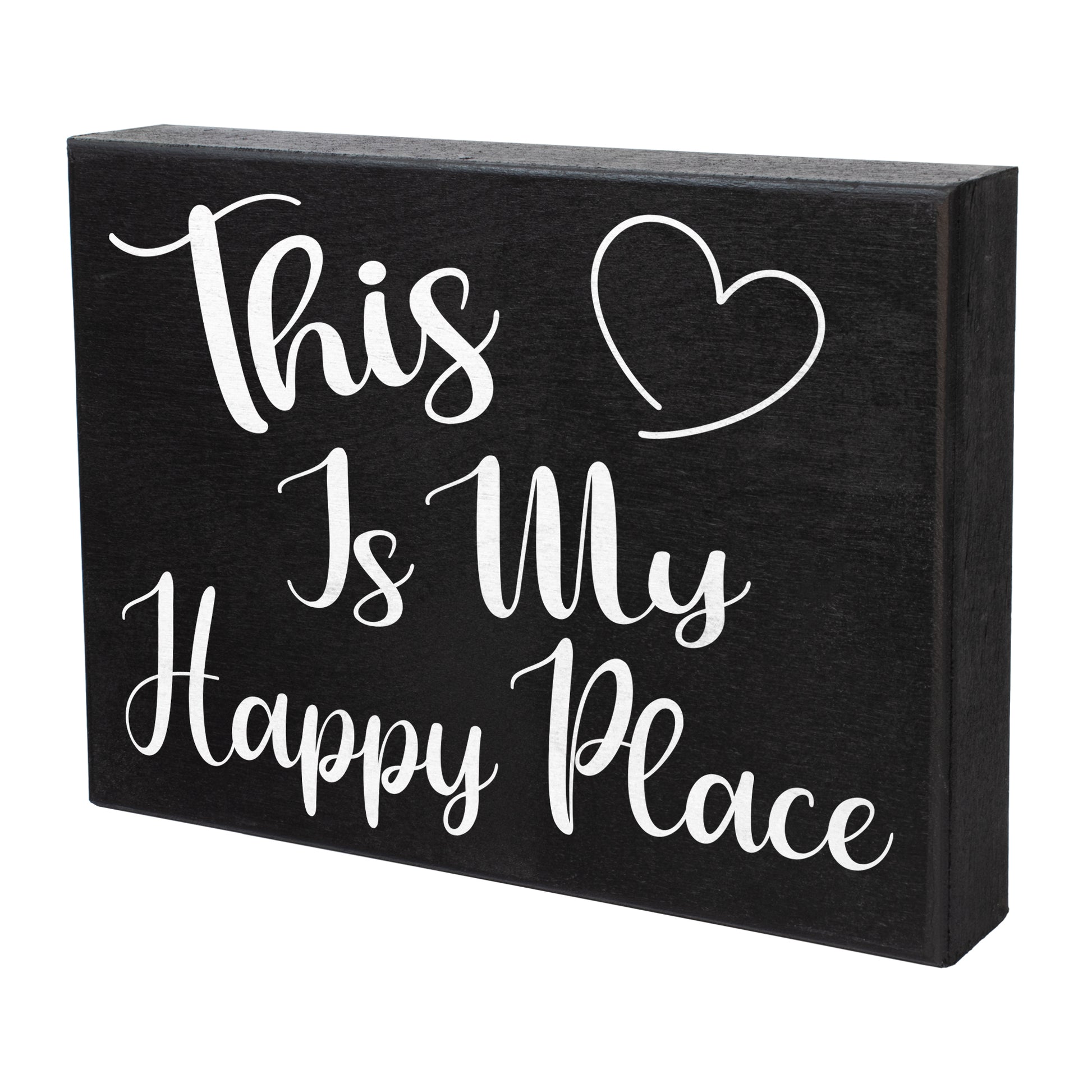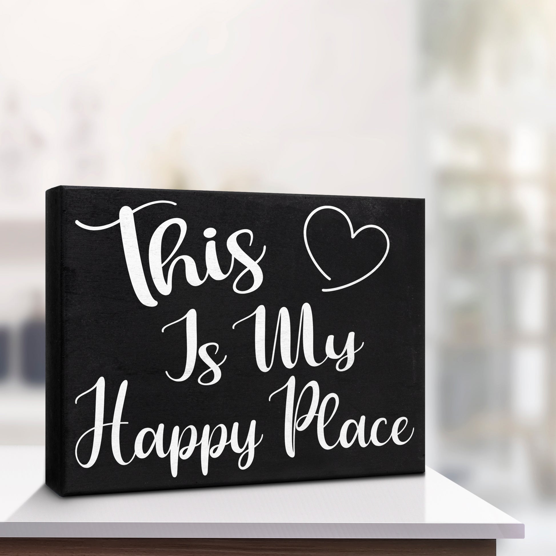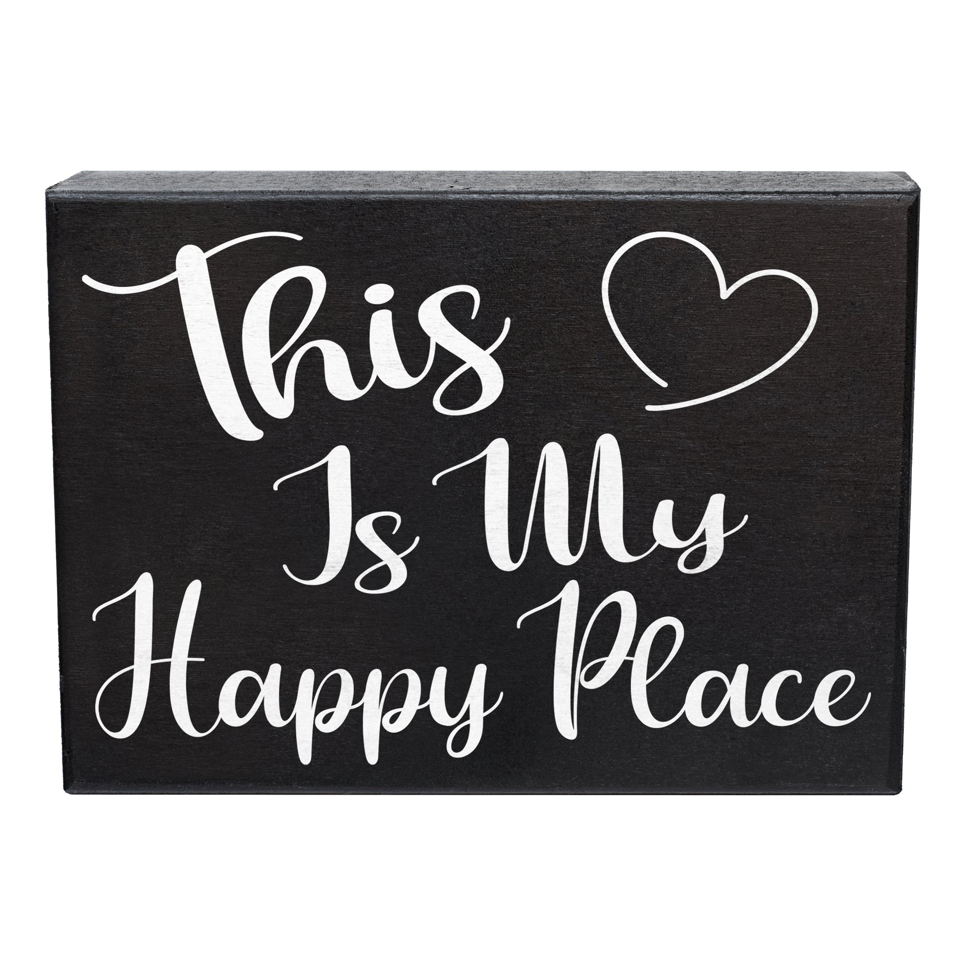 Description: Home Decor Sign 8 x 6 x 1.5 inches. Reads "This Is My Happy Place". Black decor, Farmhouse sign decoration. Sign will sit freely on a shelf it also has a hanger attached on the back to hang on a wall. Sentimental quote gift. Genuine " JennyGems" product