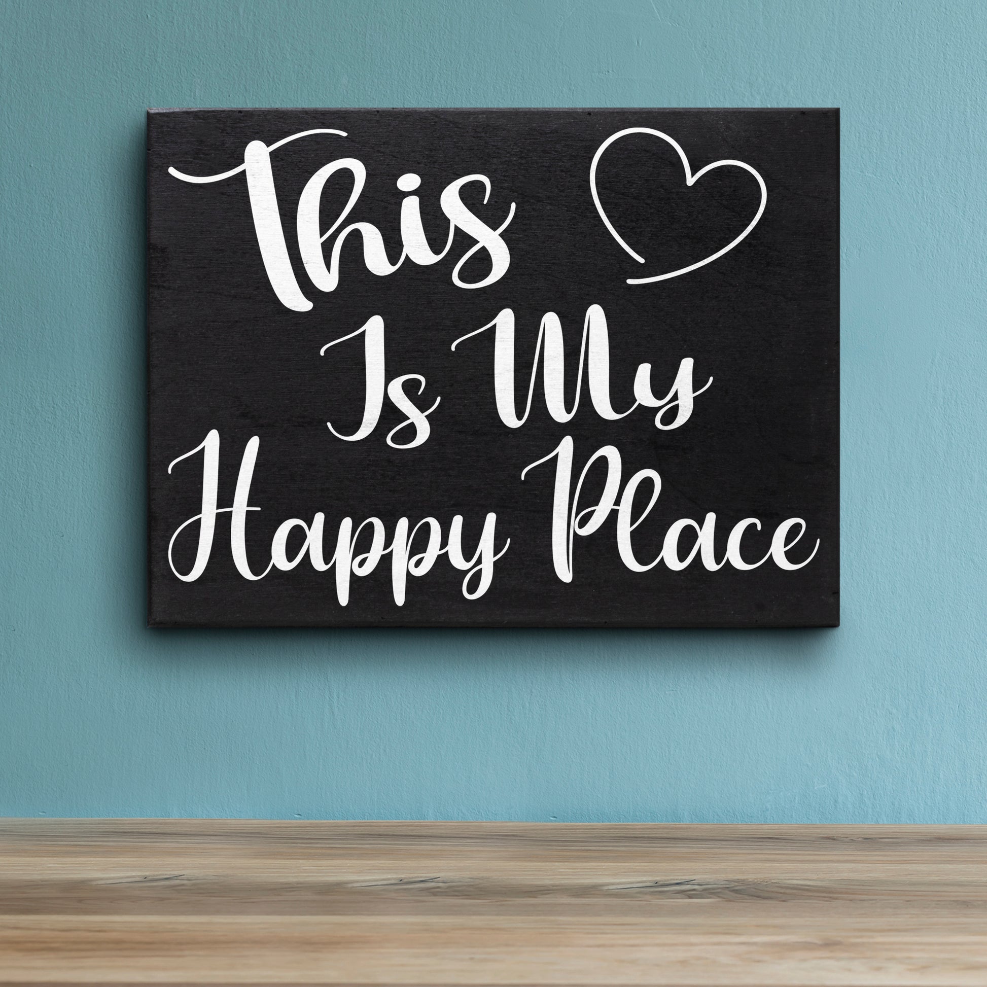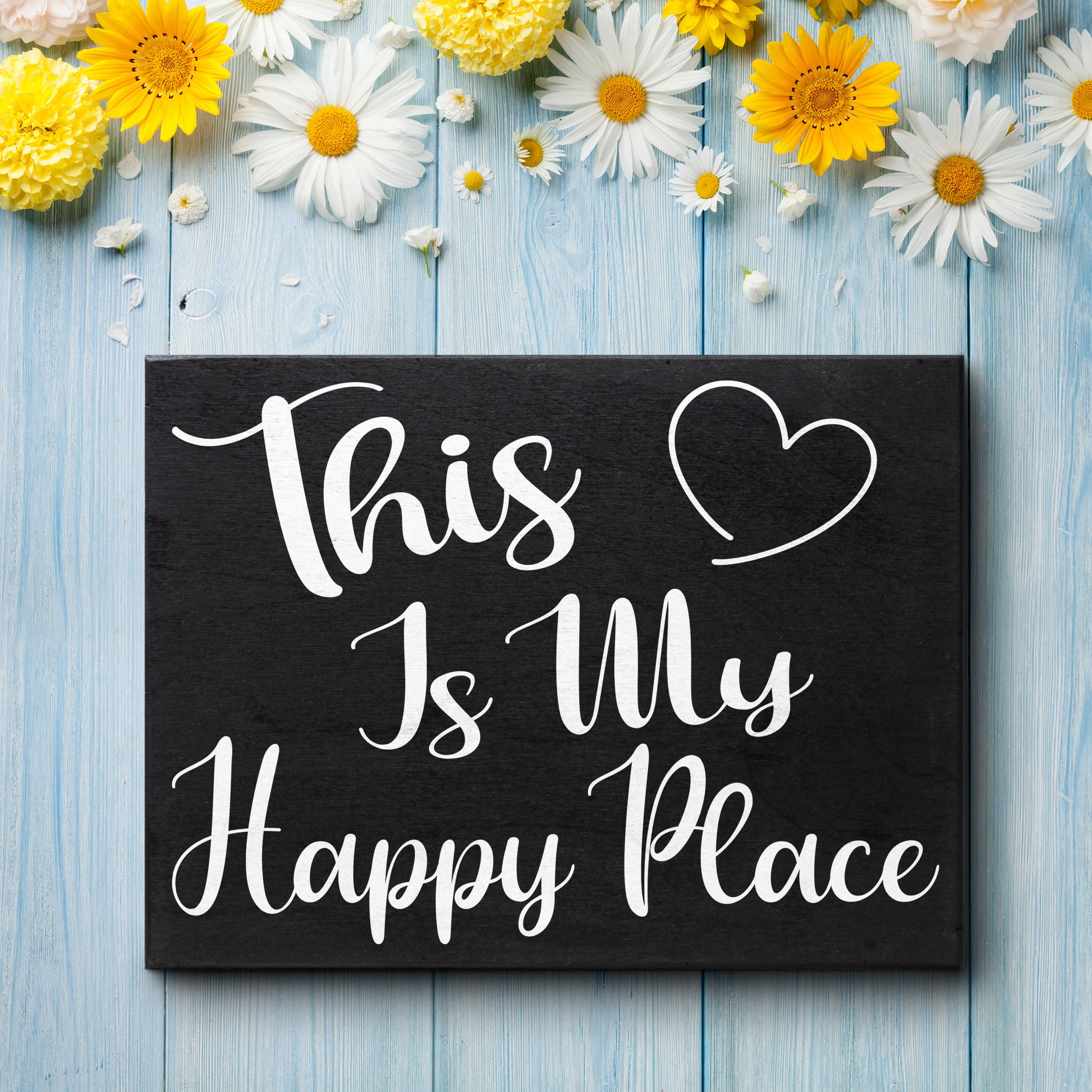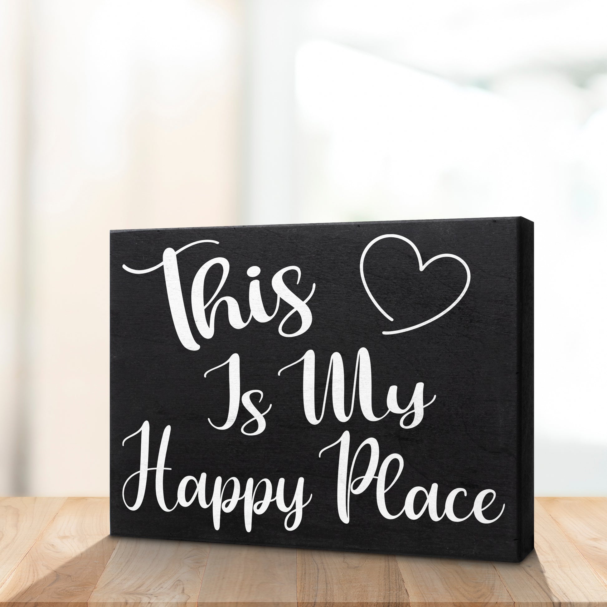 Description: Home Decor Sign 8 x 6 x 1.5 inches. Reads "This Is My Happy Place". Black decor, Farmhouse sign decoration. Sign will sit freely on a shelf it also has a hanger attached on the back to hang on a wall. Sentimental quote gift. Genuine " JennyGems" product
