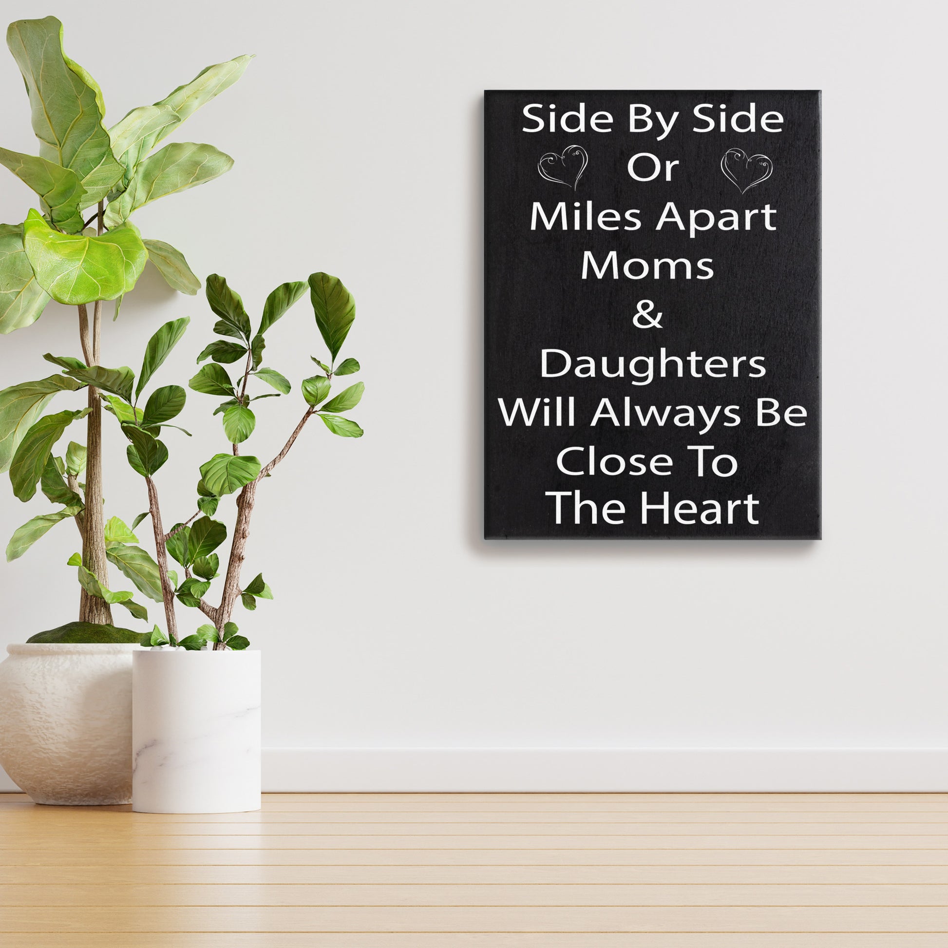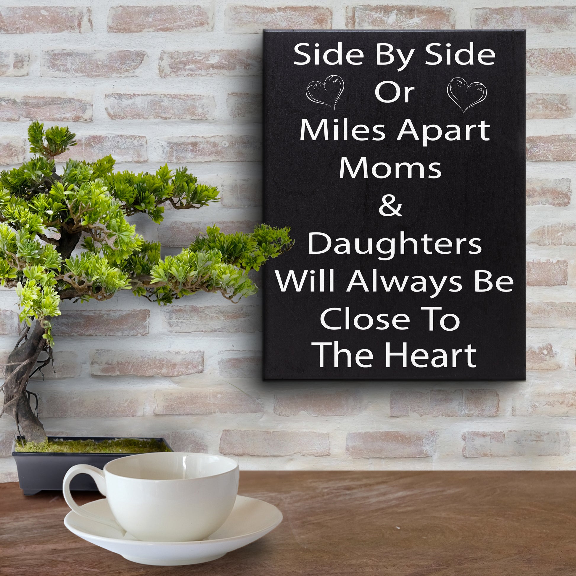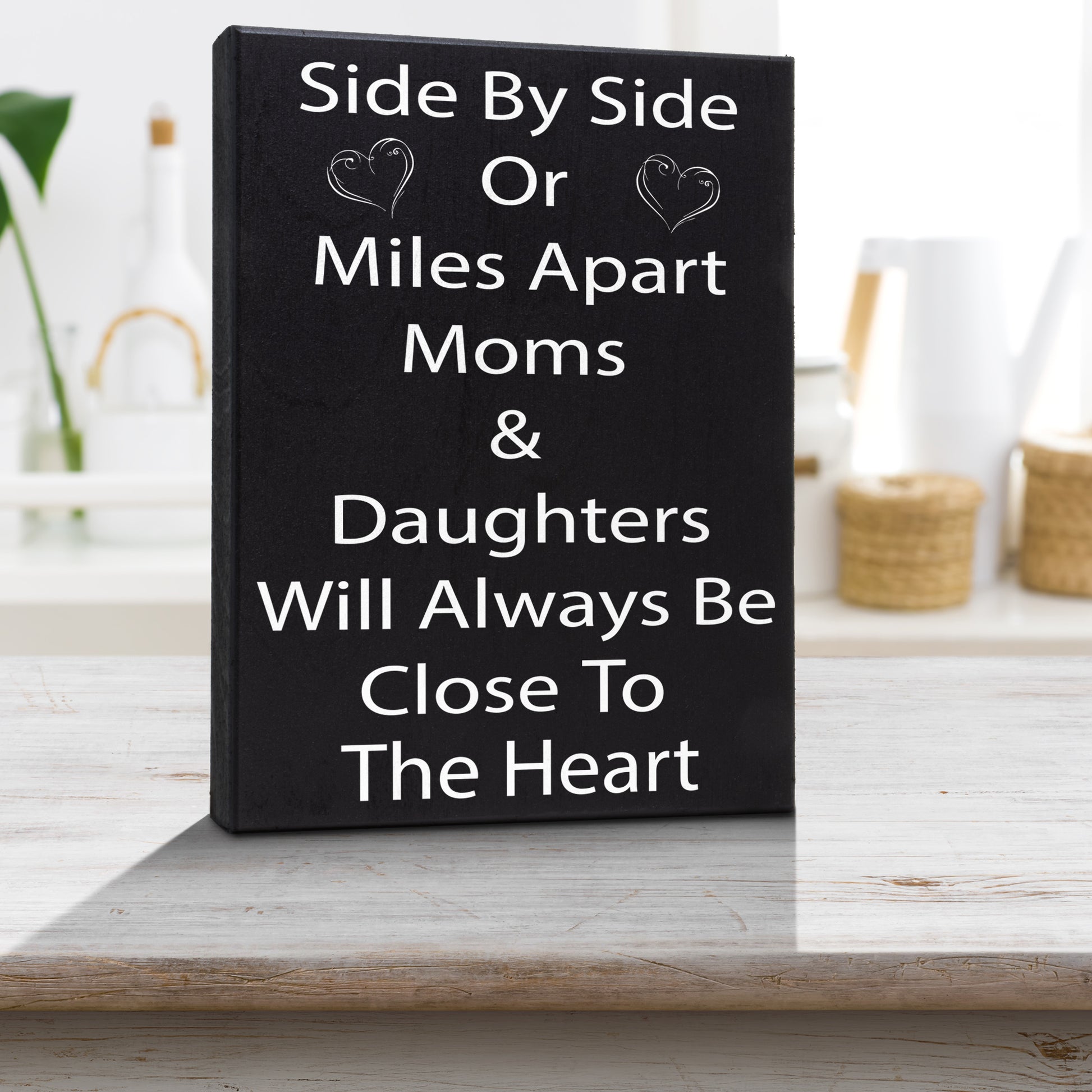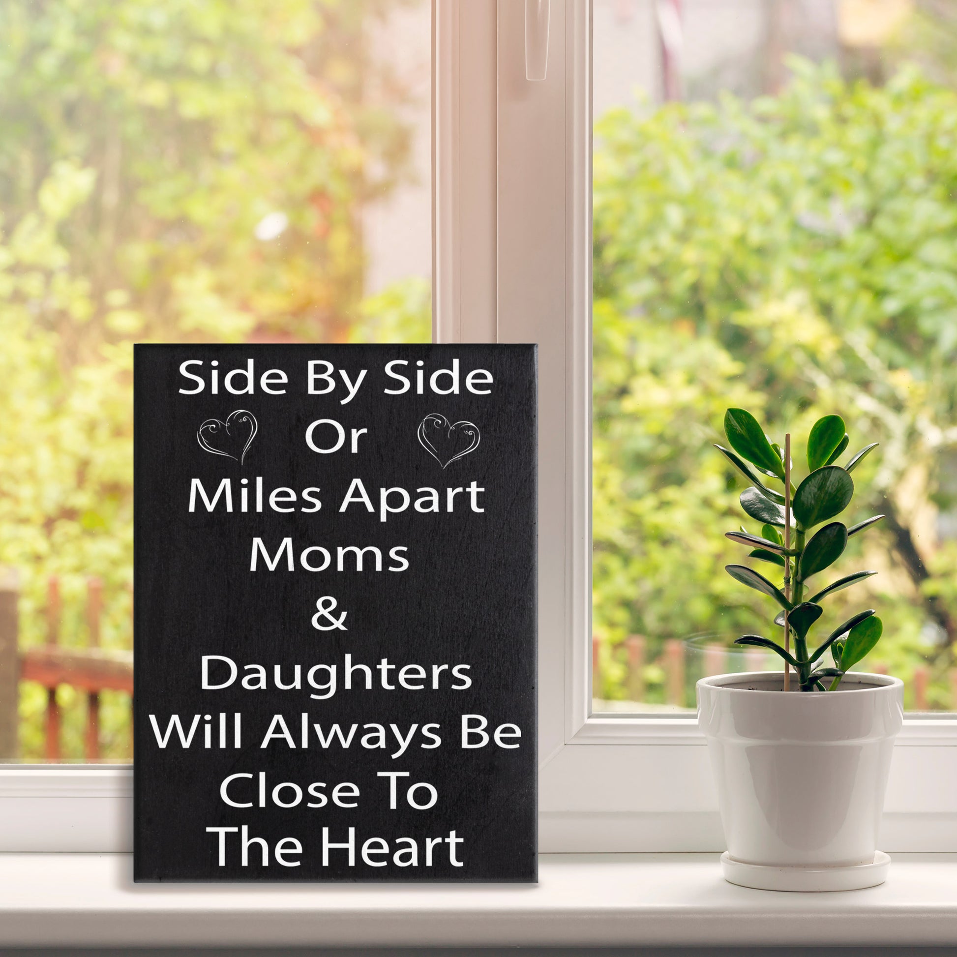 Description: Sign measures 6 x 8 x1.5 inches and reads Side by Side or Miles Apart Moms and Daughters Will Always Be Close to the Heart. Farmhouse decorative accent. This plaque will stand freely on a tabletop surface and it also has a hanger attached for wall hanging.