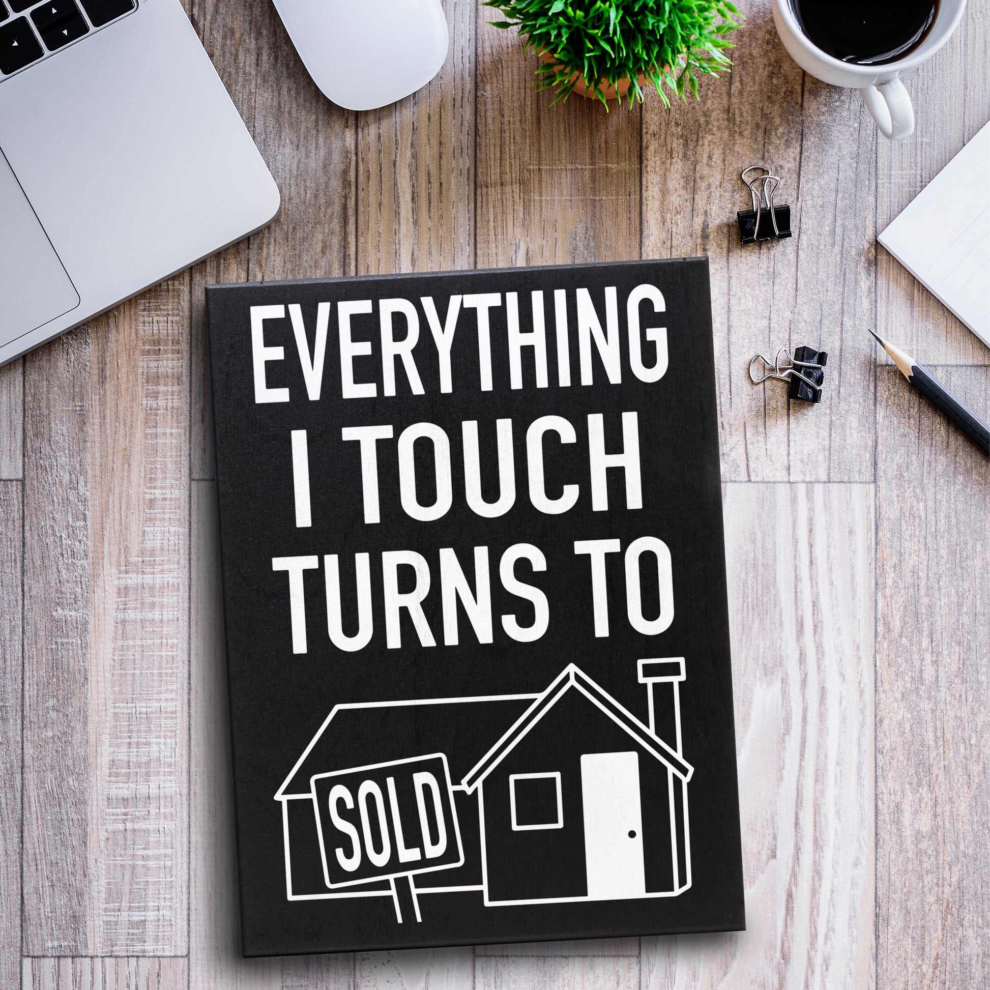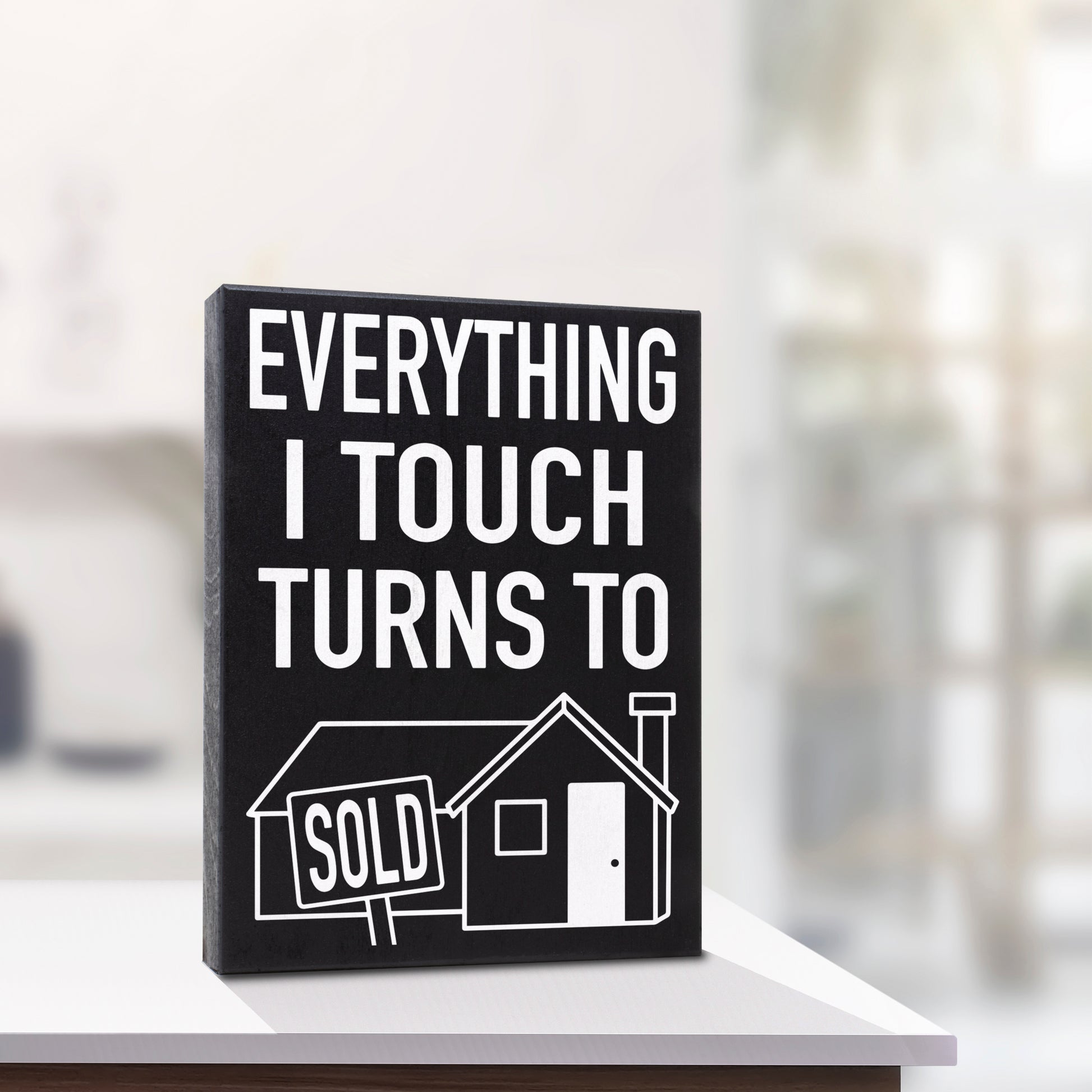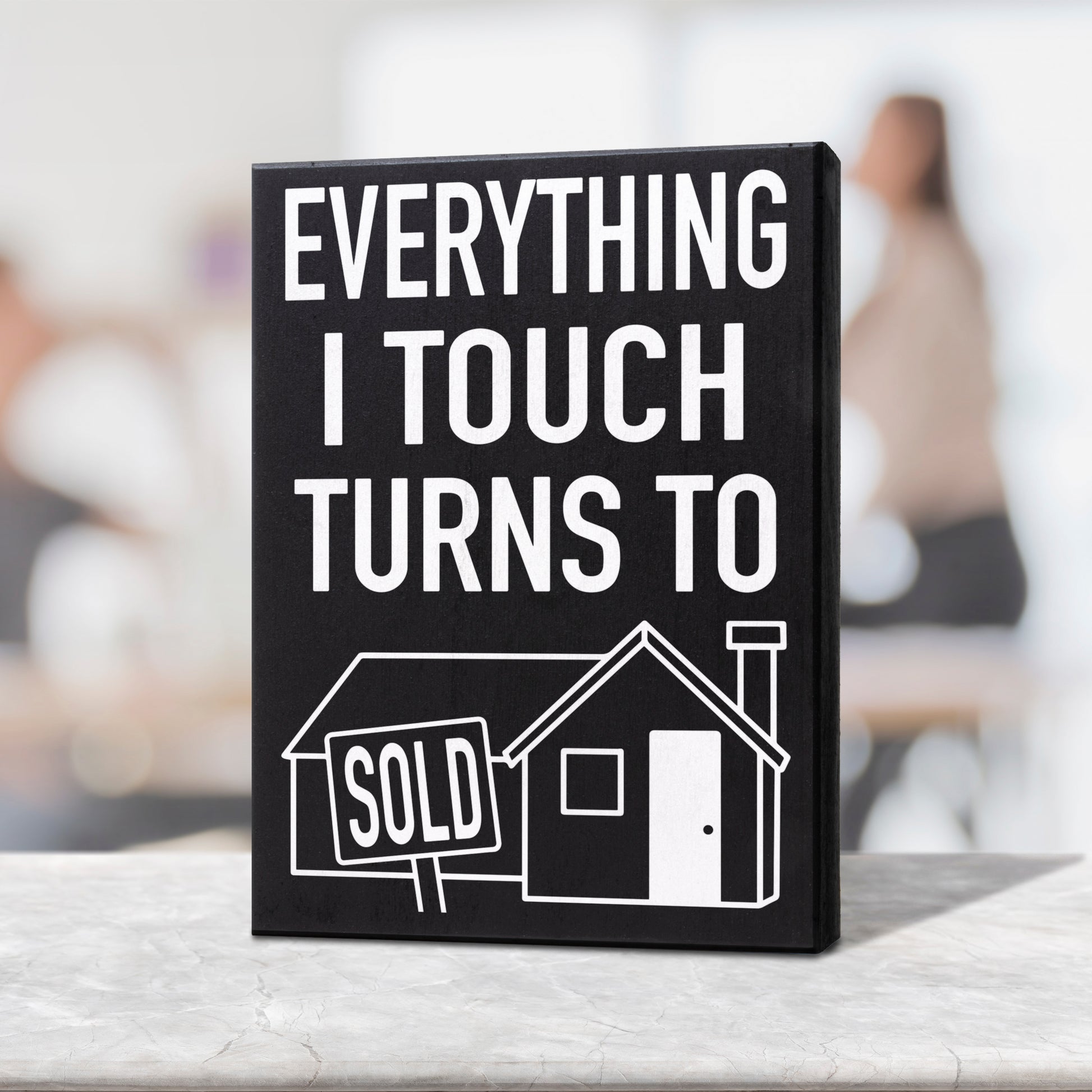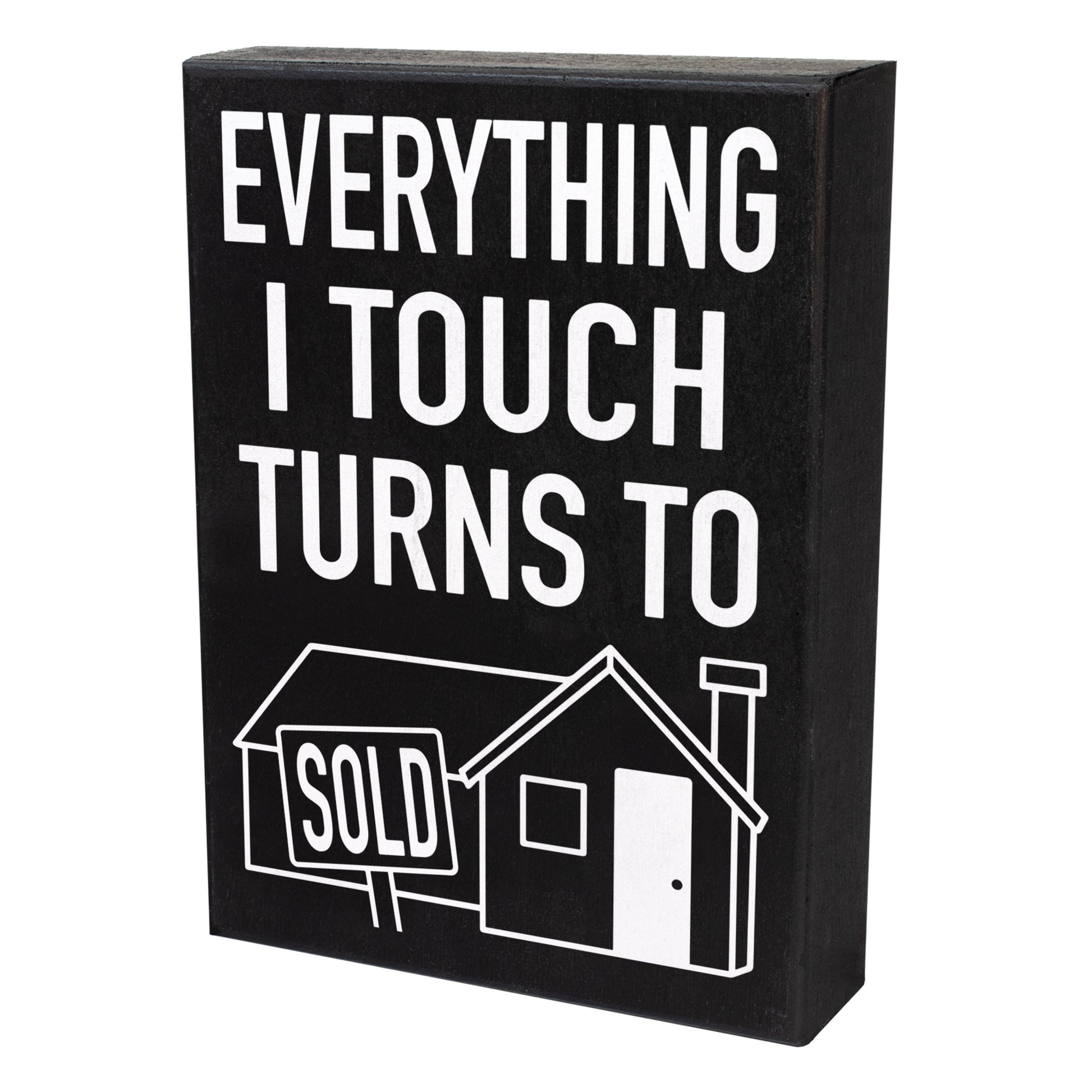 - About: American made wood sign for your favorite real estate agent, broker, or realty office. The quote on this decorative sign reads Everything I Touch Turns To Sold. Dimensions are 6x8x1.5 inches and can stand freely on a flat surface. It also has a hook for wall hanging.