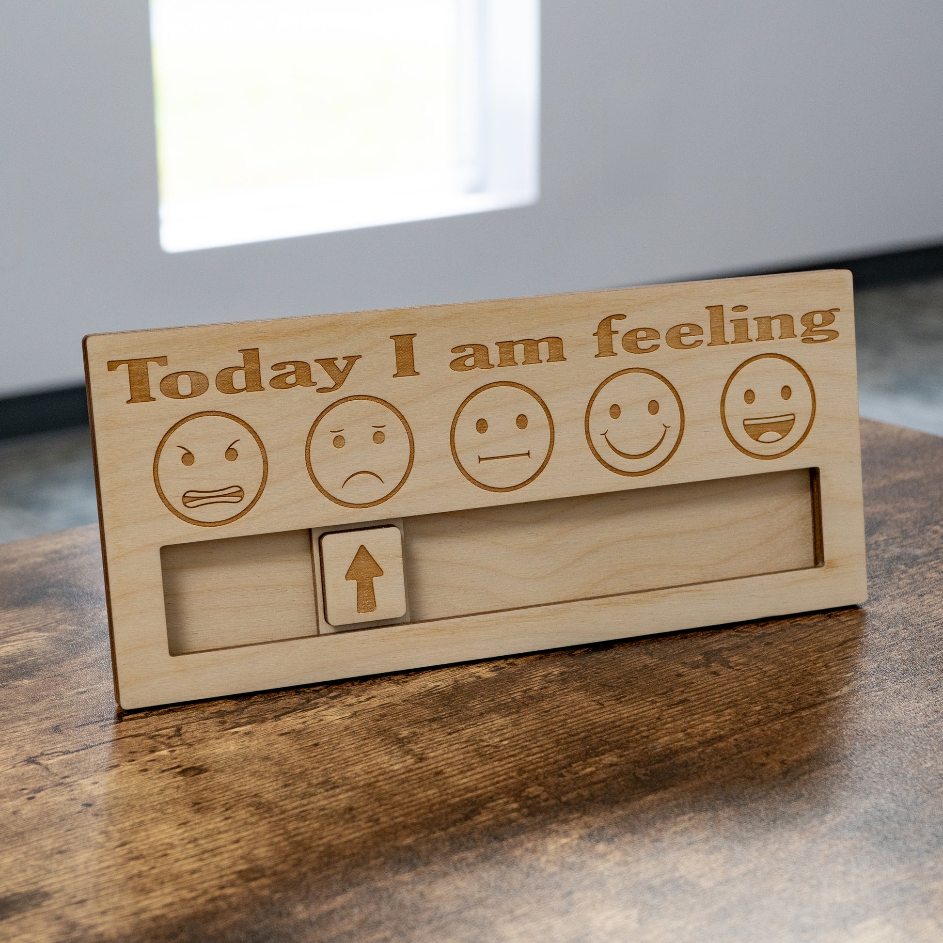 This feeling chart comes with 2 wooden dowels so it can stand on any tabletop surface such as a desk, counter or shelf. There is also a keyhole slot for wall hanging. Slide the wooden indicator to the emoji that best fits your emotion. Made in the USA.