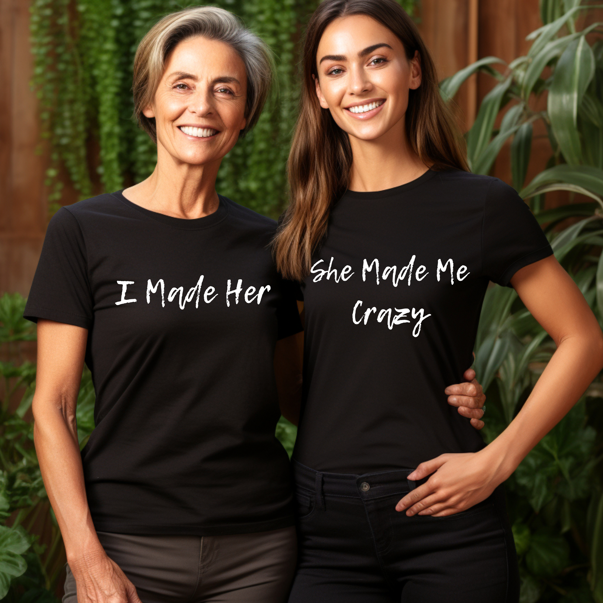 Matching T-Shirt Set: One shirt says “I Made Her” for Mom, and the other says “She Made Me Crazy” for Daughter.
