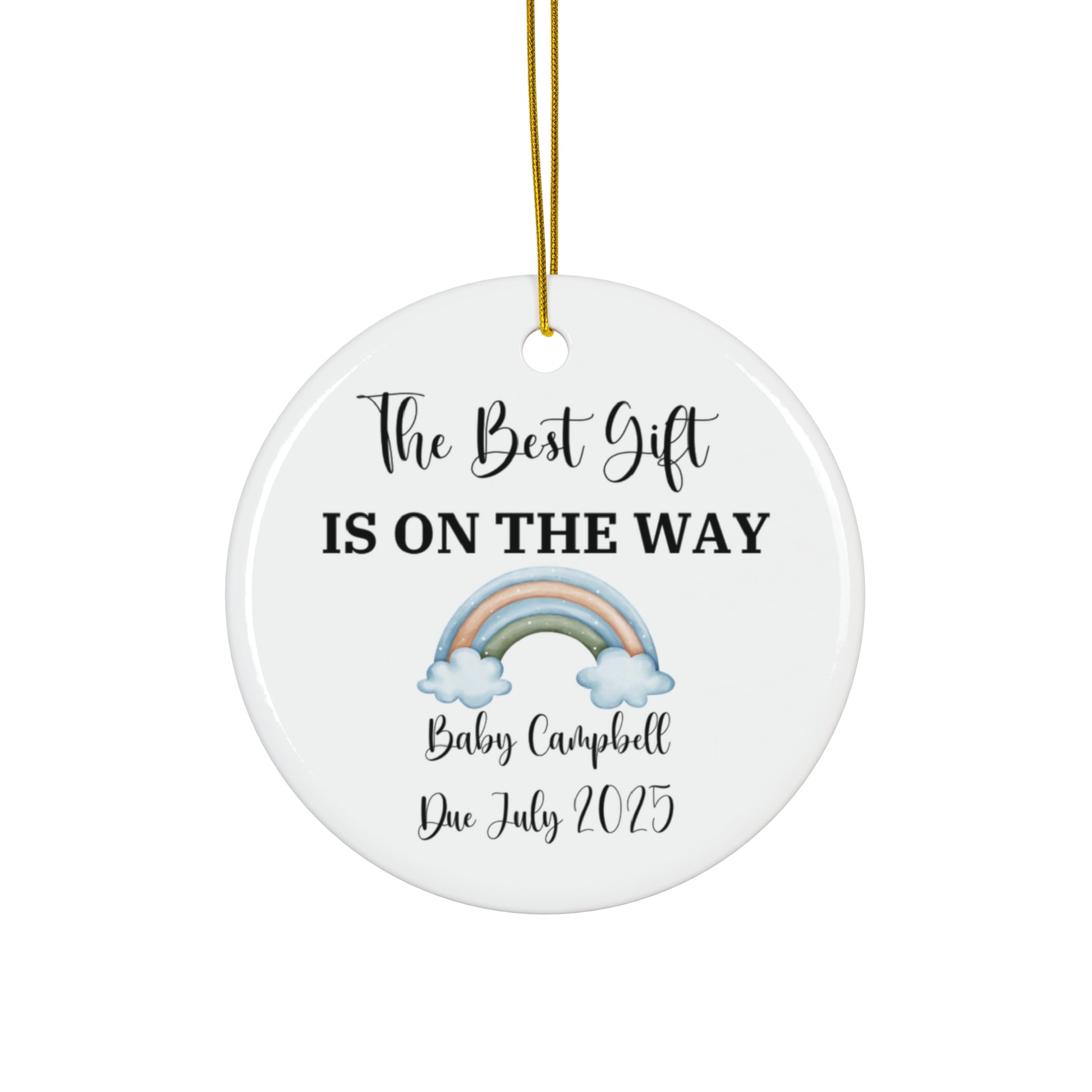 Celebrate the most exciting news in a beautiful and memorable way with this "The Best Gift is On the Way" personalized ornament. Perfect for a pregnancy announcement, this custom ornament allows you to add the baby's name and due date, making it a cherished keepsake for years to come. Whether you're announcing to family or sharing the news with friends, this ornament is the perfect way to mark the occasion.