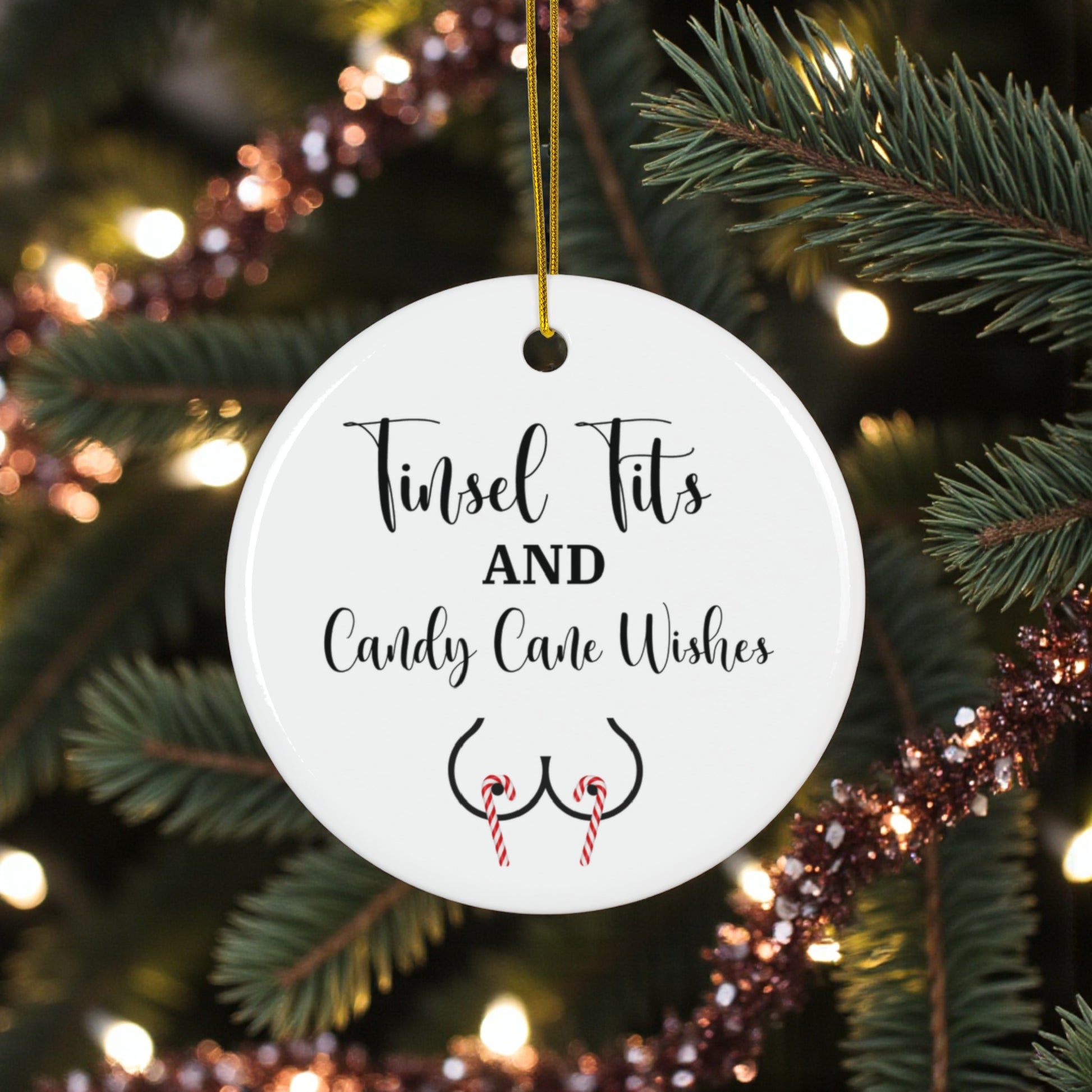 Tinsel Tits Offensive Ceramic Christmas Ornament - Funny Gag Gift for Holiday Humor. This ornament is perfect for someone with a great sense of humor who loves adding a touch of festive cheer with a twist. Ideal for those who enjoy irreverent and edgy humor during the holiday season.